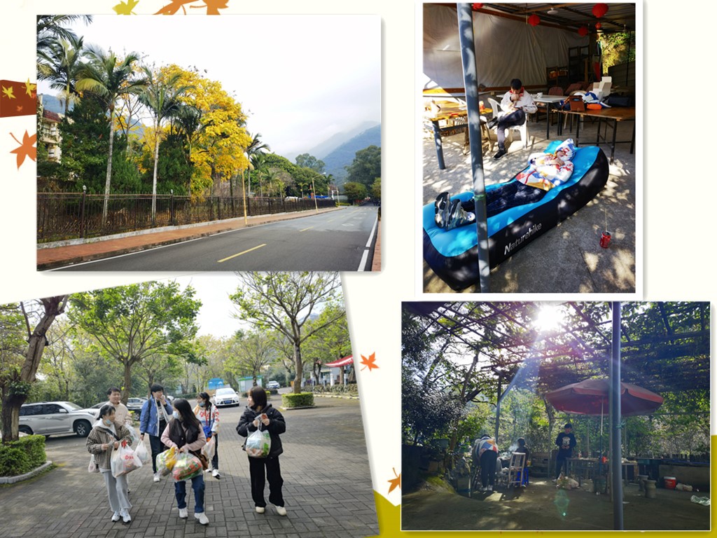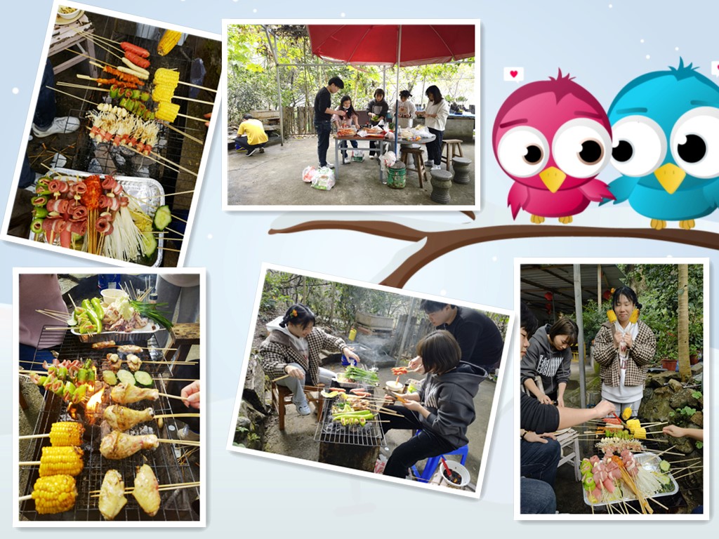 我们抵达靠里头的农家乐烧烤点,虽然这里少了点绿叶葱葱的树木,但是多了份庇护与宁静;放好烧烤食材,大家纷纷取出准备好的烧烤工具与食材,有的负责洗菜切菜、有的负责解冻串食材;老板娘也拿出木炭与树枝开始生火,林司机变为林大厨开始烤起来了,经过半小时多的共同努力,香喷喷的烧烤陆续出炉;大家一同品尝烧烤食物,在美味中谈笑风生,并结群围在一起畅聊、玩小游戏。烧烤在其乐融融的氛围中圆满结束。